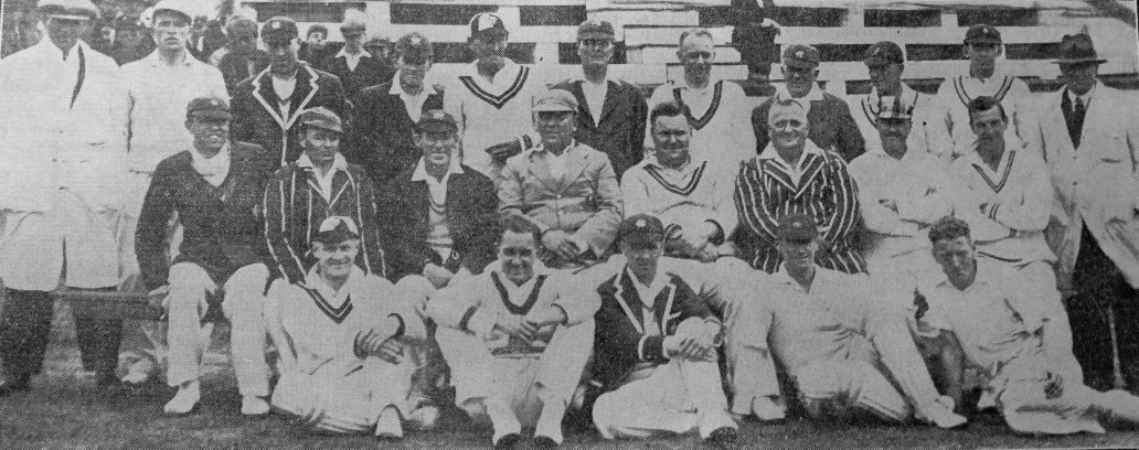 Back row: A. Launders (umpire), Raymond Burton (Brampton), Alban Turner (Hickleton), Bernard Senior (Wath), Leslie Machin (Swinton), Colin Kilner (Mitchell Main), W. A. Beardsmore (Collegiate and Norfolk), Ben King (Dinnington), Ted Dann (Dinnington), H. Flowers (Dinnington), Mr Malcolm Clark (umpire).