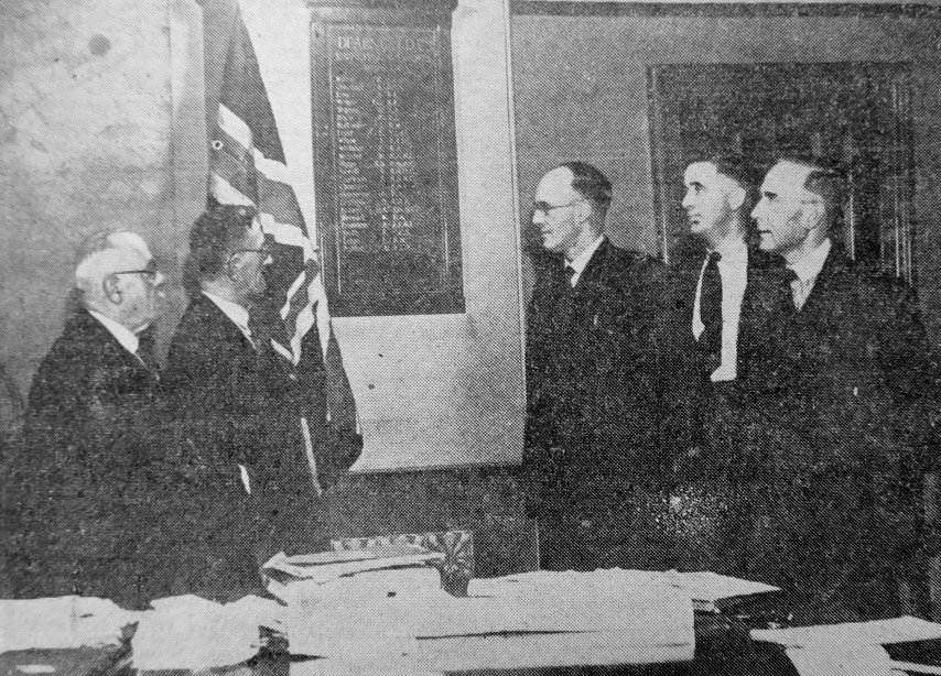 Country Councillor A. Fouchard, (second from left), unveiling the roll of honour. With him are (left to right), Coun. J. Petty, Mr. F. Hawksworth (Clerk), Mr. G. H. Allemby (Sanitary Inspector), and Mr. W. H. Adams (Surveyor).